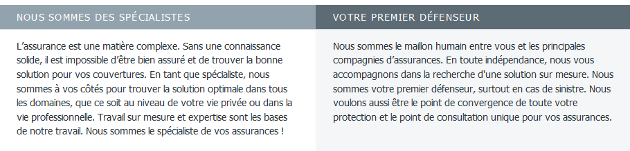 En tant que courtiers indépendants, nous travaillons avec toutes les compagnies du marché. Nous connaissons leurs produits et leurs spécificités. Nous pouvons ainsi vous conseiller en toute objectivité le produit d’assurance qui correspond le mieux à votre situation et à vos besoins. En outre, nous veillons à vous proposer toujours le meilleur rapport qualité / prix.